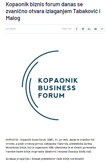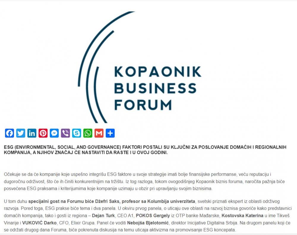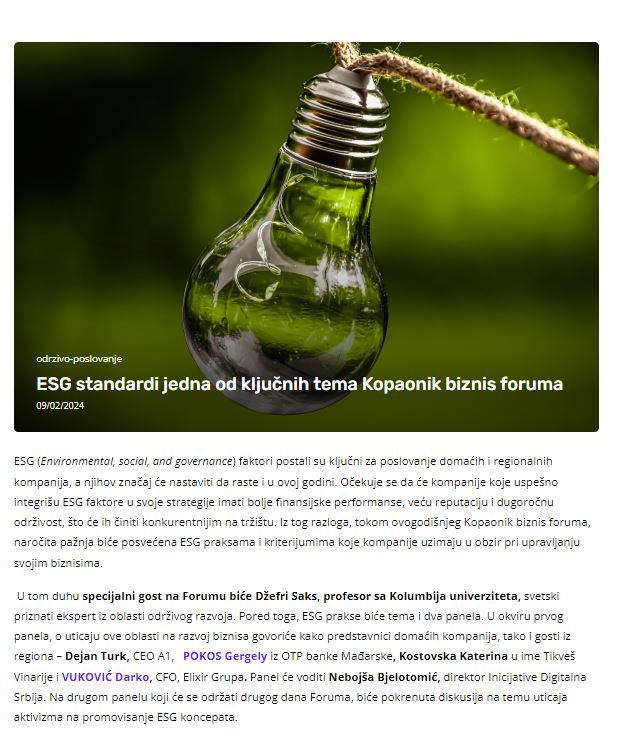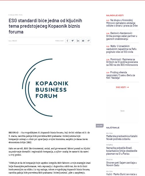 vesti.rs - ESG STANDARDI JEDNA OD KLJUČNIH TEMA OVOGODIŠNJEG KOPAONIK BIZNIS FORUMA