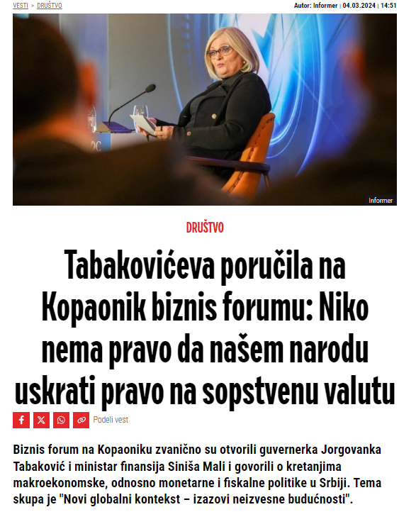 Informer - Tabakovićeva poručila na Kopaonik biznis forumu- Niko nema pravo da našem narodu uskrati pravo na sopstvenu valutu